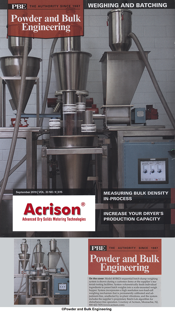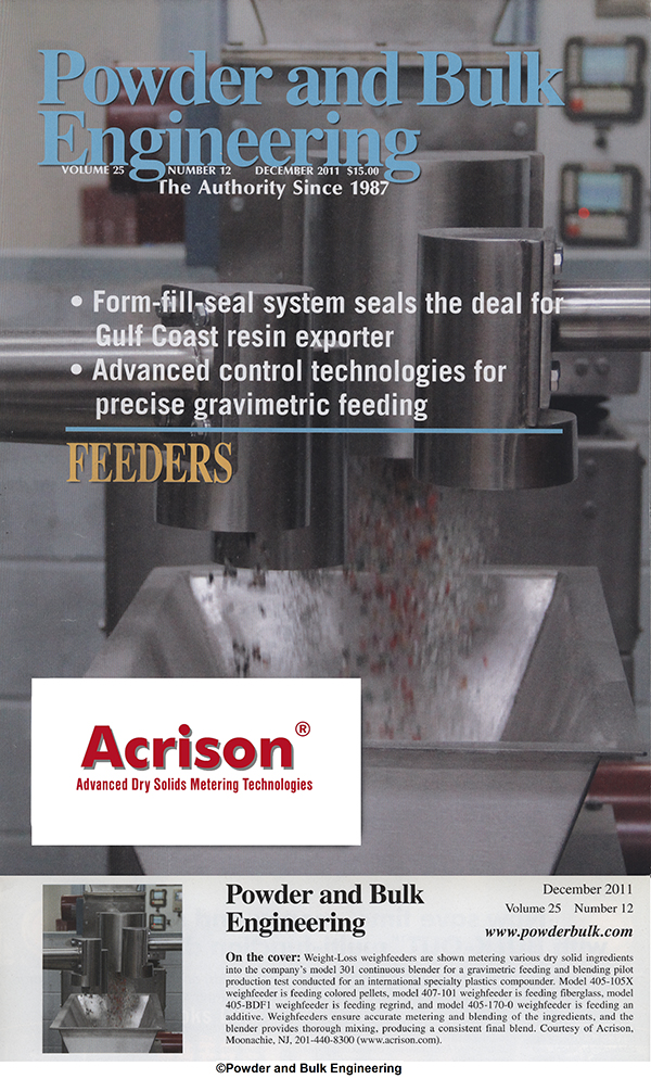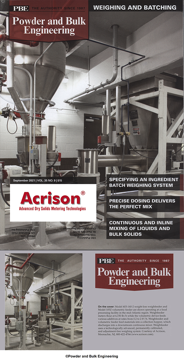 On the cover: Model 403B(D) sequential batch-dump weighing system is shown during a customer demo at the supplier’s material testing facilities. System volumetrically feeds individual ingredients to preset batch weights into a scale-mounted weigh hopper. System incorporates a high resolution non-load-cell weighing mechanism that is permanently calibrated and adjustment-free, unaffected by in-plant vibrations, and the system includes the supplier’s proprietary Batch-Lok algorithm for disturbance-free operation. Courtesy of Acrison, Moonachie, NJ, 800-422-7476 (www.acrison.com). |